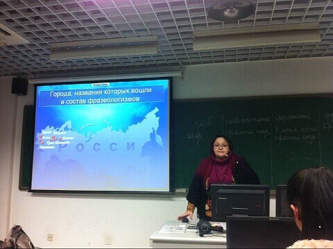 2014年11月27日下午,俄语系外教瓦连金娜?亚历山德罗夫娜向全体俄语系老师与学生做了一场名为“带有城市名的俄语成语” (Фразеологизмы с Названиями Городов в Русском Языке)的专题讲座。不同文化之间的碰撞以及对另一种文化的深入了解让同学们受益良多。首先,瓦连金娜从词汇学视角区分了单词、词组、句子、成语几个不同的概念,指出了词组与成语的构词学区分。之后,瓦连...