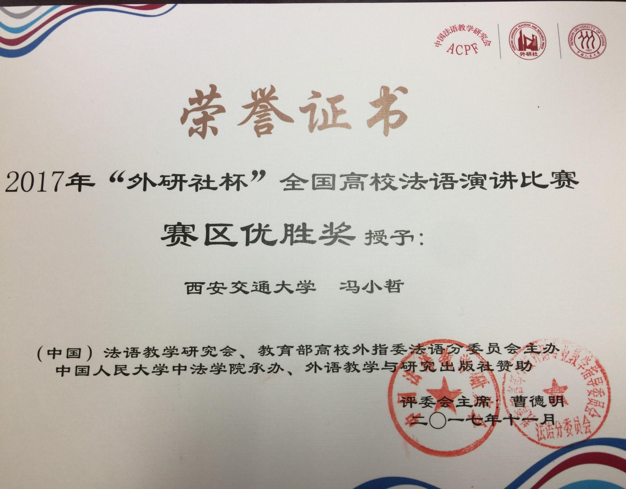 法语系四年级学生冯小哲同学在2017“外研社”全国高校法语演讲比赛中获得赛区优胜奖。该比赛由(中国)法语教学研究会、教育部高校外指委法语分委举办。