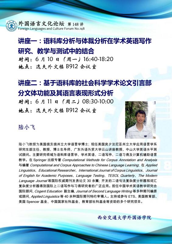 外国语言文化论坛(第148讲)讲座一:语料库分析与体裁分析在学术英语写作研究、教学与测试中的结合;讲座二:基于语料库的社会科学学术论文引言部分文体功能及其语言表现形式分析