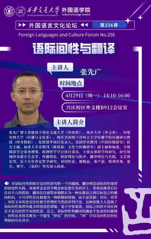 时间 4月29日(周一)14:10-16:00 地点 兴庆校区外文楼B912会议室