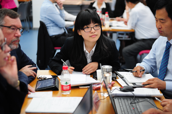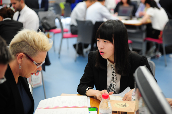 译员们分别负责13个小组模拟谈判。活动前期,管理学院的老师召开了准备会议,译员们也对活动内容进行了解,并且提前针对背景材料做了充分的准备。6月5日下午,中外双方谈判代表在翻译的陪同下彼此会面、相互寒暄。正式谈判时间为6月6日上午9时15分至11时15分,谈判人员包括四位中方在职工商管理硕士和两位来自澳大利亚昆士兰理工大学的EMBA学生。谈判情境设置在虚拟的爱丽丝星球上的一个小镇——仙境镇,中方代表当地企业双湖矿业公司,澳方代表仙境镇镇政府,双方代表以经济发展和环境保护为主要议题,针对在仙境镇进行新矿址选择、土路路面铺筑、道路保养、废弃矿区修复,税收征收和附加条款等问题进行深入谈判。在双方相互交谈的过程中,同学们流利清晰的中英双语翻译使得谈判顺利进行,为谈判双方最后达成一致协议发挥了重要作用。