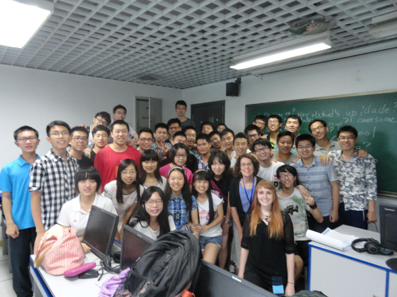 我们的外籍嘉宾Berkley和Karen两位女性,给我们带来了影响深刻的一周。Berkley年轻美丽,富有活力,这可是让工科班的男孩子们精神为之一振,学习英语的势头可足了!她的多才多艺也让我们赞叹,课堂上遇有我们不懂的词能够马上用形象的简笔画在黑板上绘出,同时对于书法也颇有研究,成为女孩子们学习的榜样。Karen是一位富有教学经验的老师,她的课堂生动活泼,她用幽默的言语,丰富的肢体语言让同学们沉浸于其中,收获了知识,亦收获了快乐。让我印象极深的是她对于我们读音的纠正。她让我们仔细观察当她发某个音时她的嘴型,细节至嘴唇的形状,牙齿与舌头的具体位置,并且不厌其烦地一遍遍重复,一个个同学验视,确保每个同学都掌握。对于读音,我们往往自以为做的不错,然而距离正确实则还是有一定距离的。Karen让我们记住了“it”要嘴唇基本不动,而“heat”要咧开嘴笑。我相信这种记忆将会成为身体的一部分,当我们开口说之时,嘴巴已经那么做了。而这也正是外籍嘉宾的魅力。