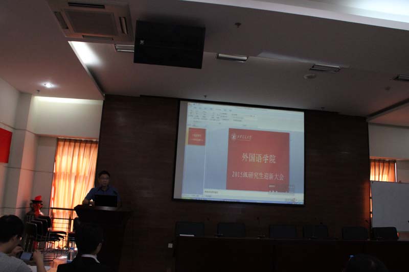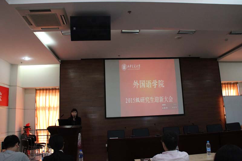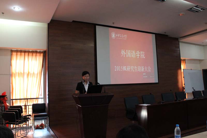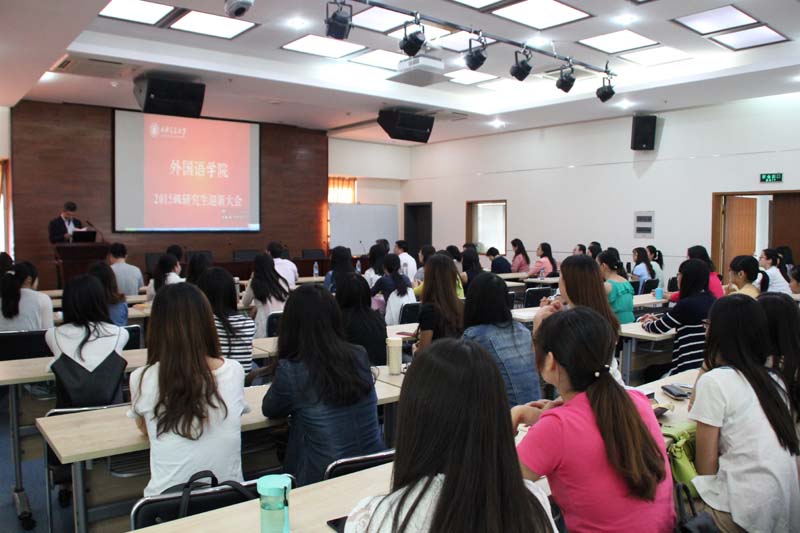 在逸夫外文楼B座10楼报告厅举行研究生迎新大会暨专业介绍会。学院分党委书记杨小渭老师、副院长郭继荣教授,以及各系中心主任、导师代表、教学秘书及辅导员出席大会。2015级全体研究生新生参加大会。迎新大会由党委副书记张长安教授主持。