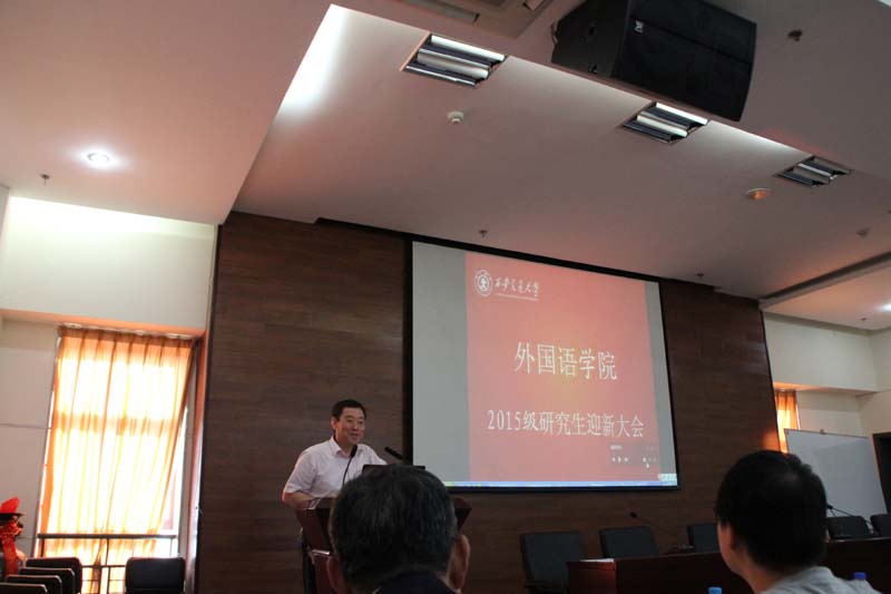 会上,郭继荣副院长代表学院致大会开幕辞。首先,他代表学院对全体2015级新生的到来表示热烈欢迎,随后简要回顾了学院的发展历程、学科硕士点和博士点的设置及科研工作总体情况。他指出,近年来学院科研工作发展态势良好,呈现不断攀升的趋势,尤其今年省部级项目获批数量取得丰硕成果,创下历史新高,其中凝聚着学院导师科研团队的不懈努力和辛勤付出。他借此也勉励广大青年教师坚持走教学与科研相结合的道路,既能传授知识,又擅搞科研。最后,他对全体2015级研究生提出五点希望:第一,潜心学习,安心做学问,摒弃急功近利的浮躁情绪;第二,积极参与导师科研项目,努力成为跨学科人才;第三,端正学术和科研态度,培养高尚的人格品行;第四,努力提升自身对于语言的认识层次和高度;第五,加强学术交流与沟通,珍惜师生缘、同学情,全面提高个人综合素质。
