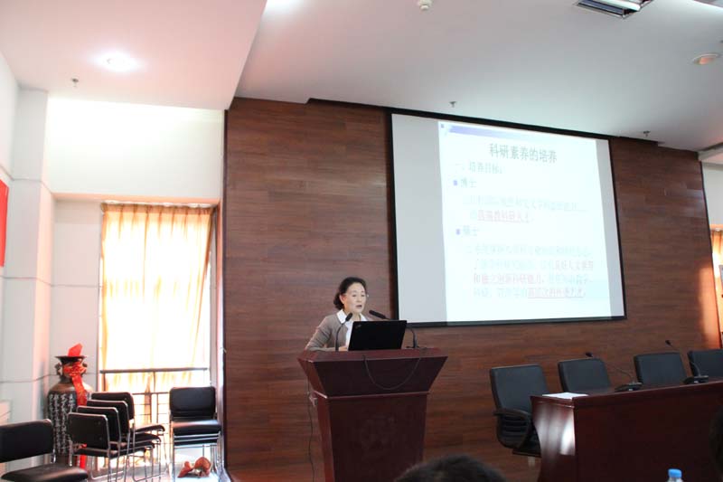 第一阶段结束后,大会进入第二阶段议程,即专业介绍会。外国语言研究中心主任、MTI教育中心主任聂文信副教授主持会议。随后,博士生导师马晓梅教授针对学术型研究生的一般性要求做了主旨发言。她以“科研素养的培养”为题,首先解读了博士及硕士研究生阶段的培养目标,其次论述了高端人才素质构成的三个方面,即学会做人,学会学习和科研以及身体健康。她重点强调了科研能力的培养的主要方法,如广泛阅读文献、掌握科学的研究方法、提高创新意识、坚守学术诚信等,最后她希望全体研究生成长为“善于沟通。敏于思辨、成于方略、坚守诚信”的优秀人才。