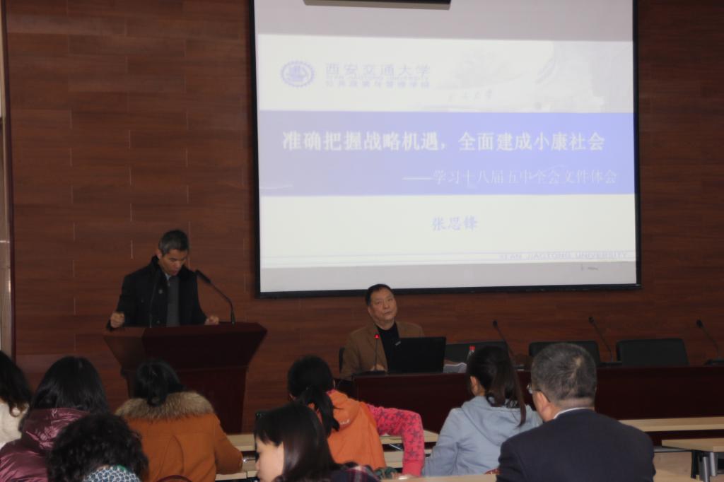 党委于逸夫外文楼10楼报告厅举行十八届五中全会精神专题报告会。公共政策与管理学院张思锋教授应邀担任主讲。学院中层以上干部、全体教工及学生党员参会学习。报告会由分党委书记杨小渭主持。
