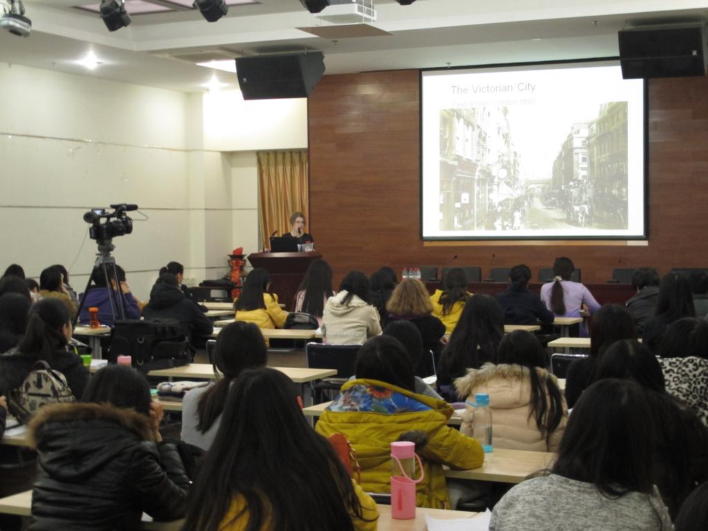 Birch教授围绕维多利亚时期英国伦敦舰队街的历史特点、人们对待劳动价值和宗教的态度以及当时的学校教育等展开历史背景分析,然后结合狄更斯的《匹克威克外传》、《大卫·科波菲尔》、《远大前程》(又译《孤星血泪》)等著名作品进行了深入而具体的分析和探讨,引起了师生们的极大兴趣。大家与Birch教授展开了热烈讨论,并围绕讲座内容从各个角度提出了10多个问题,Birch教授一一耐心回答,现场气氛十分活跃。与会师生纷纷表示,本次讲座内容丰富详实,信息量大,令大家受益匪浅。