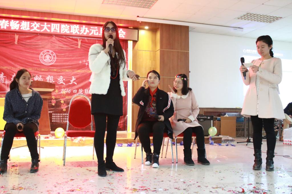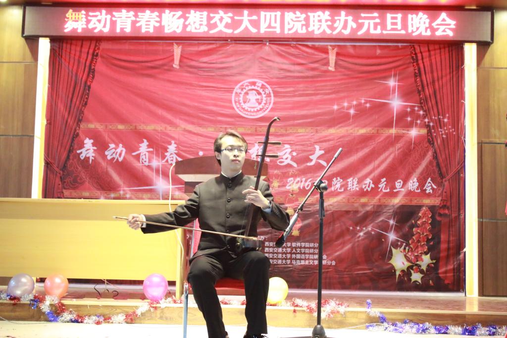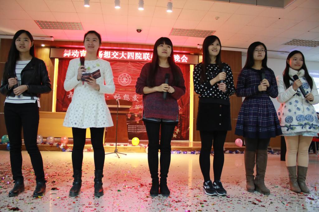 的司勤冕、邓旭婷等同学为大家带来了外文歌曲串烧《Always Music》,语言与旋律碰撞,让清新悠扬的声音在整个会场回荡。乔邦曦同学带来的《花房姑娘》获得了极高的人气,他以豪放潇洒的曲风将崔健的这首经典摇滚歌曲重新演绎。在“春”的时光里,现场的观众和台上的表演者们共同开启了一段充满温馨与回忆的旅程。吕娇娇、刘桐等带来舞蹈《不要不要》,其俏皮灵动的风格将观众们带进“夏·逐梦”的世界里,在火热的夏季,我们听了梦幻的民乐《回梦游仙》、深情的歌曲《喜剧之王》,小品《和土豪做朋友》通过幽默诙谐的表演讽刺了当下的“土豪”、“干爹”等现象。接下来是“秋·分享”的篇章,人文学院的王雨、李楚、田笑笑三位同学带来朗诵合唱《再别康桥》,优美的旋律像涟漪般荡漾开来,随后的歌曲《只要有你》、《Could You Stay with Me》仍然延续了这种抒情风格,仿佛是秋天午后的阳光洒满大地,慵懒而舒适。而李阳君、武彦妮、王胜男等同学带来的小品《研究生N次方》则展现了一名研究生面对生活的挫折,以积极乐观的态度处之的故事,精巧的设计、搞笑的剧情将会场的气氛推向又一个高潮。在尾篇“冬·孕育”中,李巍的《鸿雁》和田宇欣的《龙文》表现出了专业级的演唱水平。来自马克思主义学院的同学们以一首《爱因为在心中》表达了对班级、对学院、对交大的爱,并为整场演出画上了圆满的句号。晚会中,同学们除了欣赏精彩的节目,还参与了现场抽奖,多名幸运的同学收获了即将到来的新年的第一份礼物。