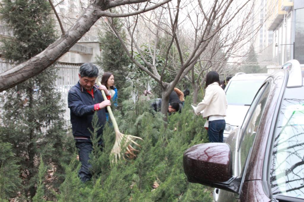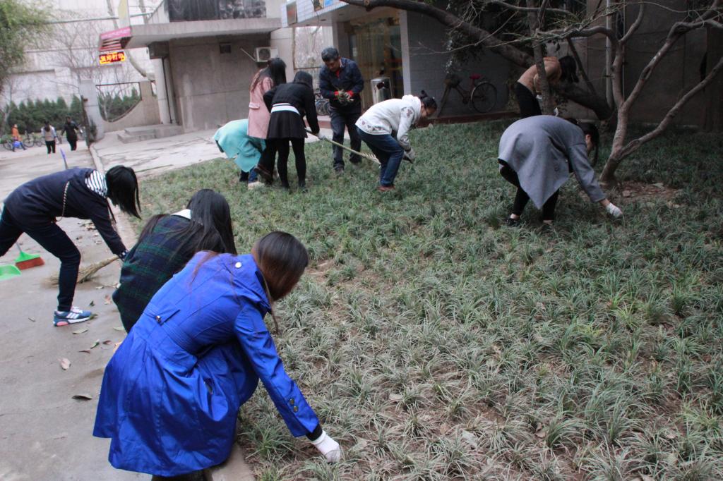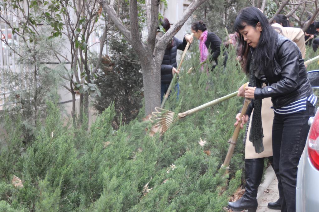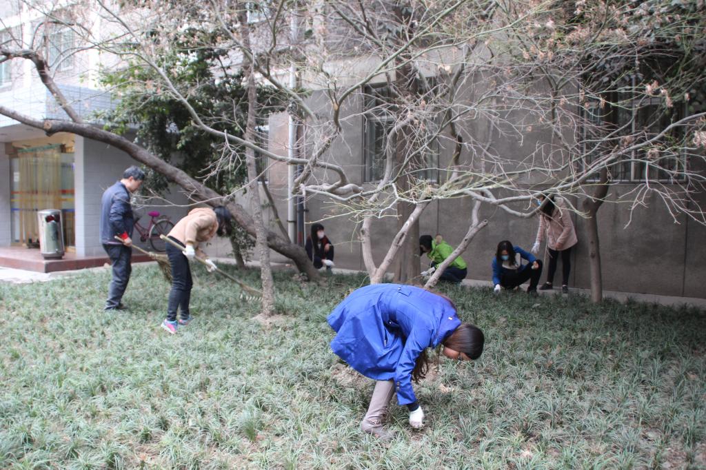 党政领导、各系中心主任、教工及研究生党员首先对外文楼周边的花坛进行了清理和打扫,花坛内部落叶大量堆积,学院院长陈向京,分党委副书记、副院长张长安,副院长王敏带头亲自上阵,深入花坛内部,清理长久堆积的落叶和垃圾,全身沾满泥土也毫不在意,辛勤劳作,展现了领导不怕苦,肯实干的优良作风,让大家倍受鼓舞。大家都不顾尘土落叶飞扬,深入花坛,热火朝天的开启清扫模式。经过师生辛勤劳作,落叶和灰尘遍布的花坛焕然一新。