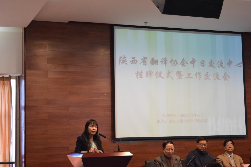 西安外国语大学日本文化经济学院副院长吴少华理事在大会上致辞,她表示一定支持中心的工作,希望中心今后能开展一些务实的活动,为陕西省的日语工作者及日语专业的学生提供一个交流的平台。