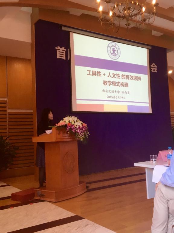 的发展历程,详细介绍了交大思辨教育的课程设置和理念,系统总结了交大思辨教育的经验。她指出,交大思辨课目前采用理论课加实践课的方式,有效的统一了思辨教育的工具性和人文性。老师系统的课程辅导,加以学生为主体的辩论实践,真正让学生能学以致用、活学活用。 陈向京教授还用辩论课中一个具体的教学目标“立论”为例,详细分析了听说读写和词汇的具体教学方法。这种“课程内容、语言能力、思辨能力一体化”的教学大纲得到了在座各所院校教育专家和老师的一致认可。最后,陈老师分析了中国思辨教育工作者的难题:一方面,教师们普遍认识到思辨教育的重要性,另一方面,很多青年教师面对晋升、评审职称的压力,对思辨教育力不从心。思辨教育似乎变成了烫手的山芋,对思辨教育的研究几乎完全依赖于教师个人的热情和责任心来实现。通过分析自己的思辩教育经历,陈教授鼓励青年教师创新、巧妙地在课堂中运用思辨教育,将科研和教学有机结合,灵活应用各所在学校提供的各类教育资源。陈教授对思辨教师职业发展的建议详尽而坦诚,赢得了大家的阵阵掌声。