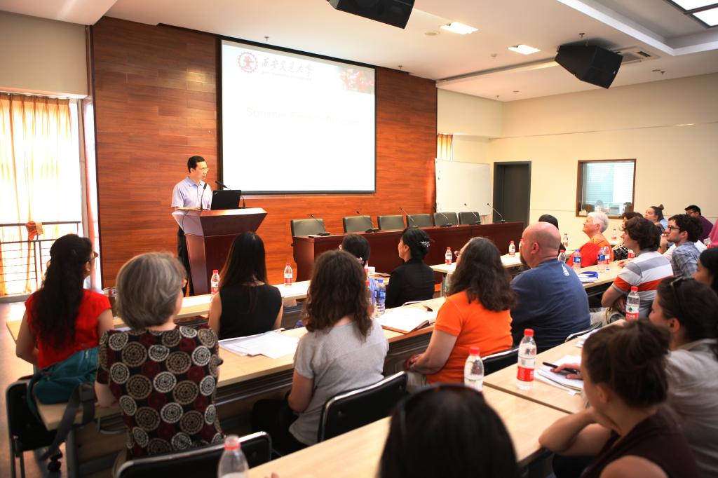 大学英语教学中心的师资、教学、课程设置等情况,随后公布了本届小学期英语强化实践项目的一些具体安排。在中方老师的组织下,外籍嘉宾们与实习生们分组集中。同组的嘉宾和实习生们进行自我介绍,相互认识,并共进午餐,游览校园,以帮助嘉宾们更快地熟悉环境。