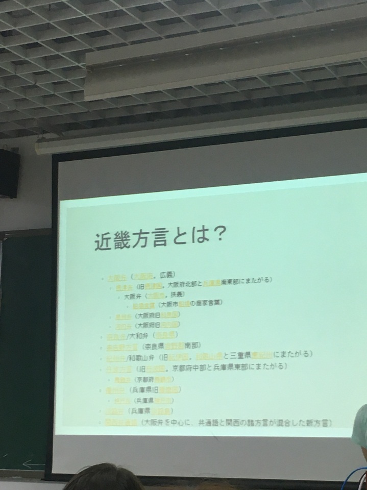 最后在同学做完各自的发表之后,竹下老师也带来了自己做的关于关西方言的发表。关西地区方言自成一个体系,语音语调和词汇都与日本的“普通话”——标准语有很大的差别。竹下老师从买东西砍价时使用的语言入手,带着同学们领略关西方言与标准语的差别,体味了关西地区独有的语言风情。竹下老师还一句一句地教同学们说关西方言,在老师和同学们的一片笑声中本次生动的讲座告一段落。