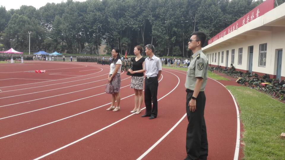 分党委书记杨小渭、副院长程冰、学生工作专职委员许明、院办主任孙波玲、辅导员马薇来到学校东南田径场慰问学院2016级参加军训的新生。