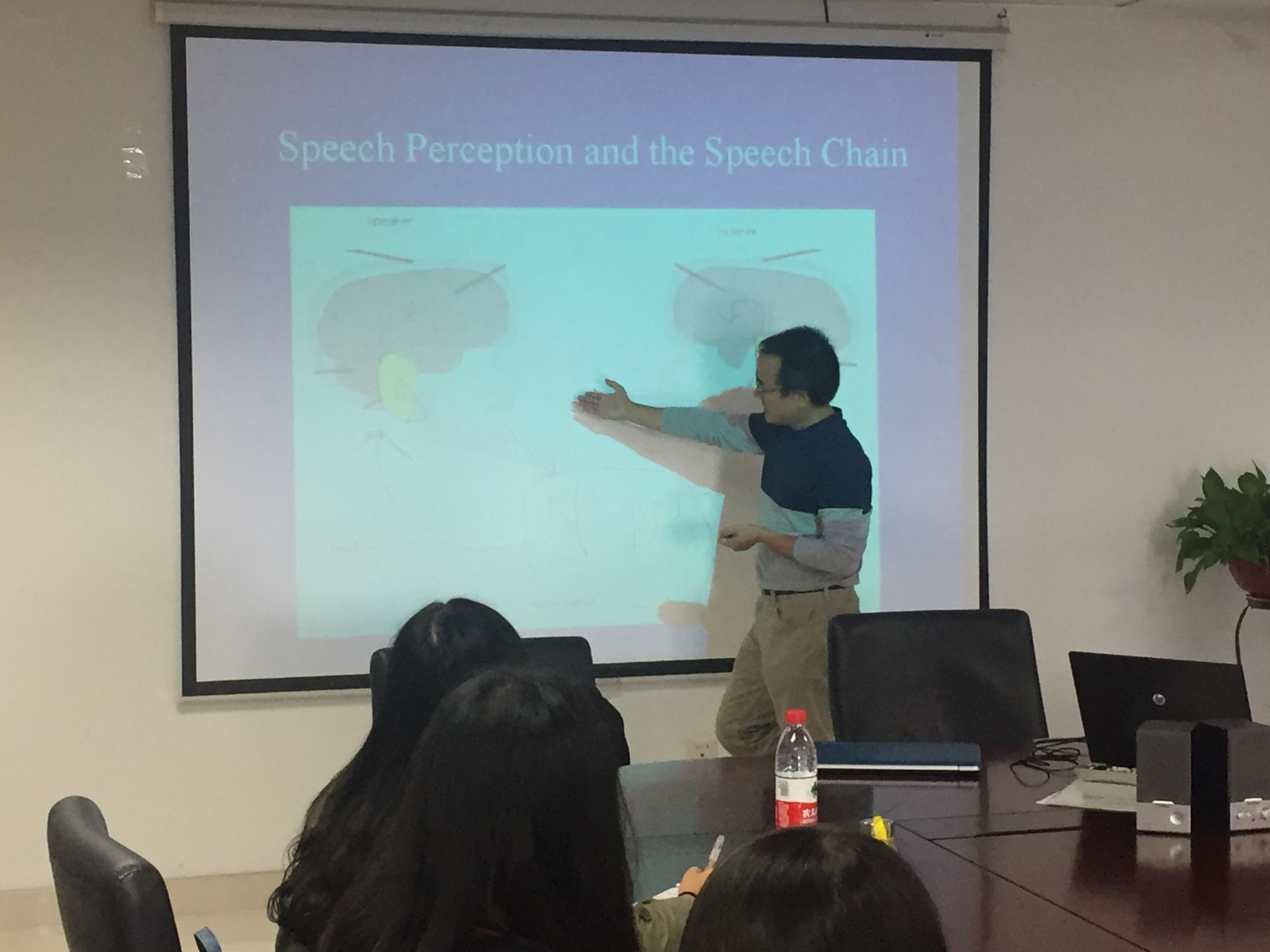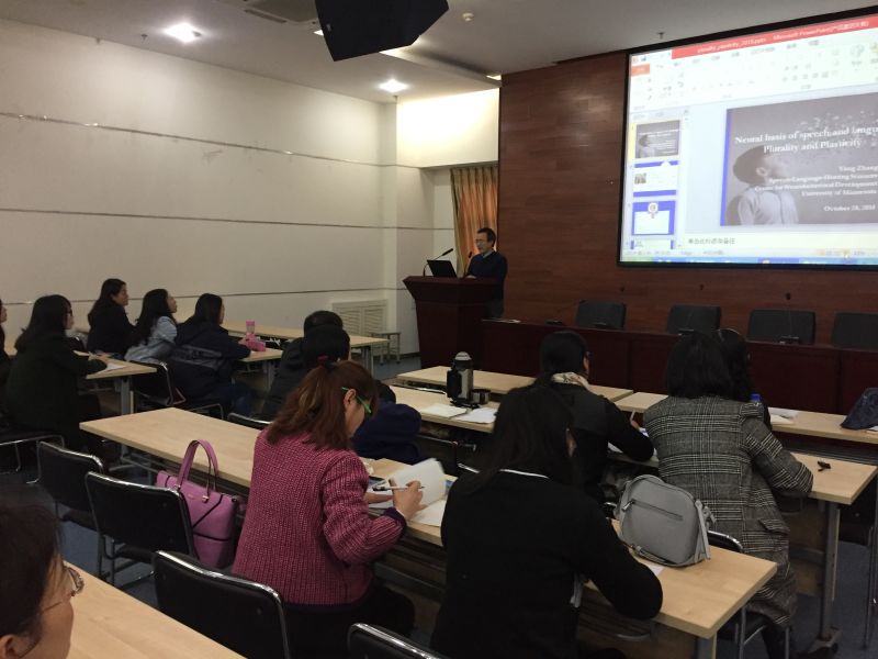 语言与认知神经科学实验室新建立之际,美国明尼苏达大学言语—语言—听力科学系副教授、神经行为发展研究中心教授张扬来到西安交大进行为期一个月的访问,为语言与认知神经科学实验室的投入使用提供重要技术指导。访问期间,张扬教授被聘为西安交大兼职教授,应邀作了两场关于“语言习得和语言病理的大脑神经机制研究”的精彩报告,并进行了一次脑电实验演示。
