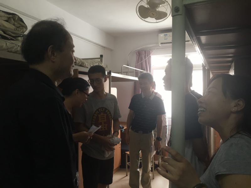 党委书记杨小渭、副书记许明,英语系班主任赵葆珉、常虹,日语系班主任孙莉,法语系班主任李文君,研究生辅导员马薇在彭康书院院务主任助理、外语2017级本科生辅导员朱宏伟的陪同下冒着酷热先后来到新生入住的东17和东7宿舍看望学生。