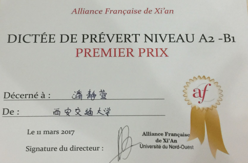 法语61班同学潘静萱同学获得A2-B1组一等奖