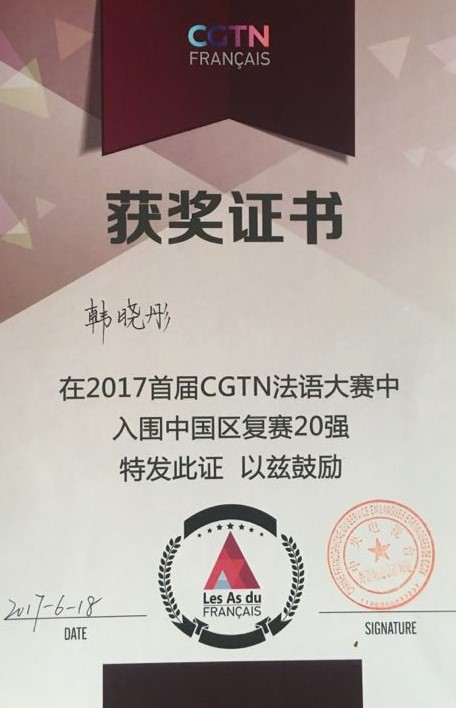 这次赛事为韩晓彤同学提供了展示其法语能力的机会,开阔了视野,让她在更广阔的天地结识更多有才能的法语人。