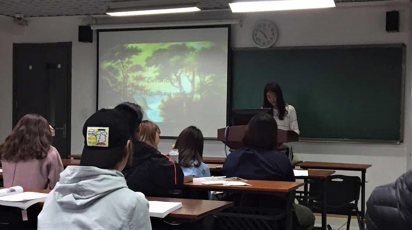 比赛开始前,霍愿老师首先致辞,向所有参赛选手表示欢迎,并希望大家能够“借助文字与声音的力量,穿越时空,去感受自然、艺术与人性之美。”各位选手在《月夜》(艾辛多夫)、《有获》(歌德)、《大地多么美丽》(莱尼克)三篇德语诗歌及《安妮日记》节选片段中自选一篇进行朗诵。24名来自英德双语专业和英语专业的选手用抑扬顿挫的语调、饱满充沛的情感、准确清晰的德语发音为大家呈现了艾辛多夫眼中的月夜、歌德偶遇的花香、莱尼克深爱的大地以及安妮·弗兰克那稚嫩的文字间流露出的温情与爱。在比赛过程中,有选手精心准备了PPT与配乐,令听者仿佛身临其境,更细腻地品味诗人的感情。