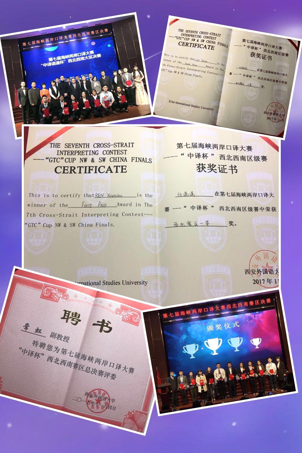 2017级MTI翻译硕士研究生任潇潇荣获西北赛区一等奖(本赛区1名),刘雅恬获三等奖(本赛区5名);常虹副教授获评优秀指导教师。任潇潇同学将代表西北赛区参加2017年12月在对外经济贸易大学举办的第七届海峡两岸口译大赛大陆总决赛。