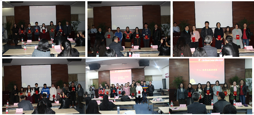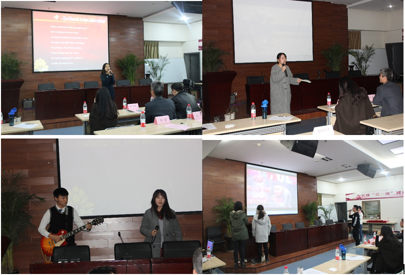 随后进行的是表演和颁奖环节。首先由周格非同学进行了精彩的表演——演唱英文歌曲《make you feel my love》。张丹老师和杨小渭老师为英语演讲、英语辩论、英语口译大赛的获奖者进行了颁奖。之后,朱思懿同学带来了俄语诗朗诵《七月夏日的皇冠》,赢得了观众的阵阵掌声。段琛老师和王奕老师为俄语朗诵和德语朗诵大赛的获奖选手进行了颁奖。然后,姬佩琳和连通达同学表演了日语吉他弹唱《wherever you are》。张丹老师和李莹老师为日语朗诵大赛、日语风采大赛、日语口译大赛和日语配音大赛的获奖者颁奖。谢逸飞、刘正培、马梦、叶雨涵等同学带来了最后一个节目,电影配音表演《神偷奶爸》。最后,段琛老师和杨小渭老师为外文配音大赛和外文歌曲大赛的获奖者进行了颁奖,许明老师和李莹老师为优秀志愿者进行了颁奖,颁奖环节圆满结束。