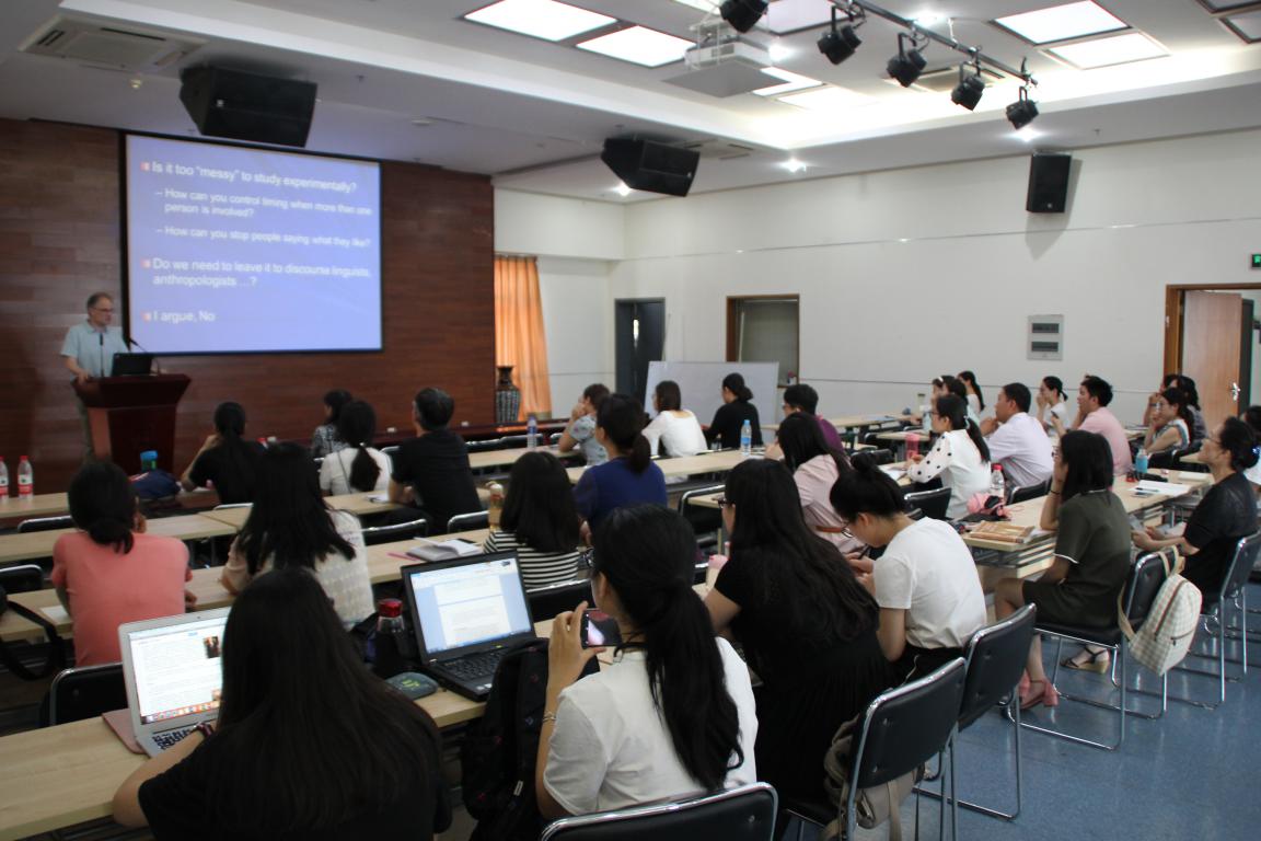 揭牌仪式后,Martin Pickering教授针对互动协同及其应用开展题为Alignment in dialogue and the representation of language的讲座。Martin Pickering教授借助典型的实验范式对对话中协同的定义,协同的发生机制,英汉中的词汇表征,双语表征,实验语言学中的启动现象以及协同和启动的关系问题提出了自己的看法,进行了详细讲解。Martin Pickering教授认为对话之所以顺利进行的原因是对话双方表征的协同,这种协同可以发生在情景模式层面以及语言层面,如句法,语义,语音,词汇。Martin Pickering教授通过综述前人的实证研究使在座的老师和同学更好地了解在各个层面发生的协同现象。讲座中的第二个核心问题是跨语当中的协同效应,Martin Pickering教授通过综述不同语种的实证研究,发现双语中的跨语启动可以是共享表征的,如荷兰语和英语就共享PO和DO的句法连接。讲座中的第三个核心问题是将启动和语言距离结合起来。教授通过综述前人研究发现,相似翻译会比不相似翻译的启动效果更明显,而这种相似性往往和语言距离有关。最后,Martin Pickering教授介绍了心理语言学中结构启动的实验范式。