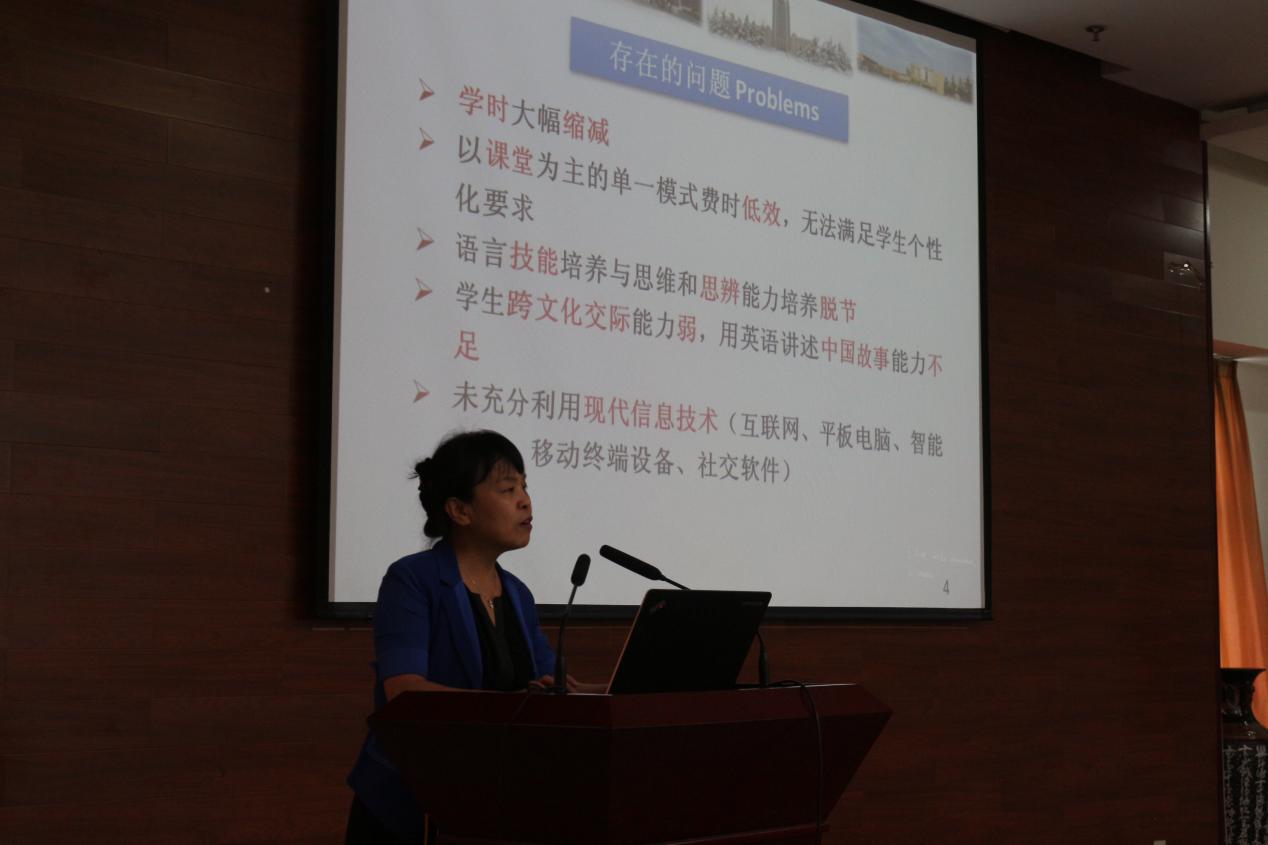 王敏教授作了题为“基于互动协同的视听说教学:理论与实践”的报告。她指出,互动协同将激发创造性模仿,大学英语教学应该根据学生水平和教学需要设计不同明晰度和强制程度的任务,激发协同。随后,徐梅老师、卫朝霞老师和李莹老师分别结合自身教学经验,分享了视听说教学的新思路和新模式。