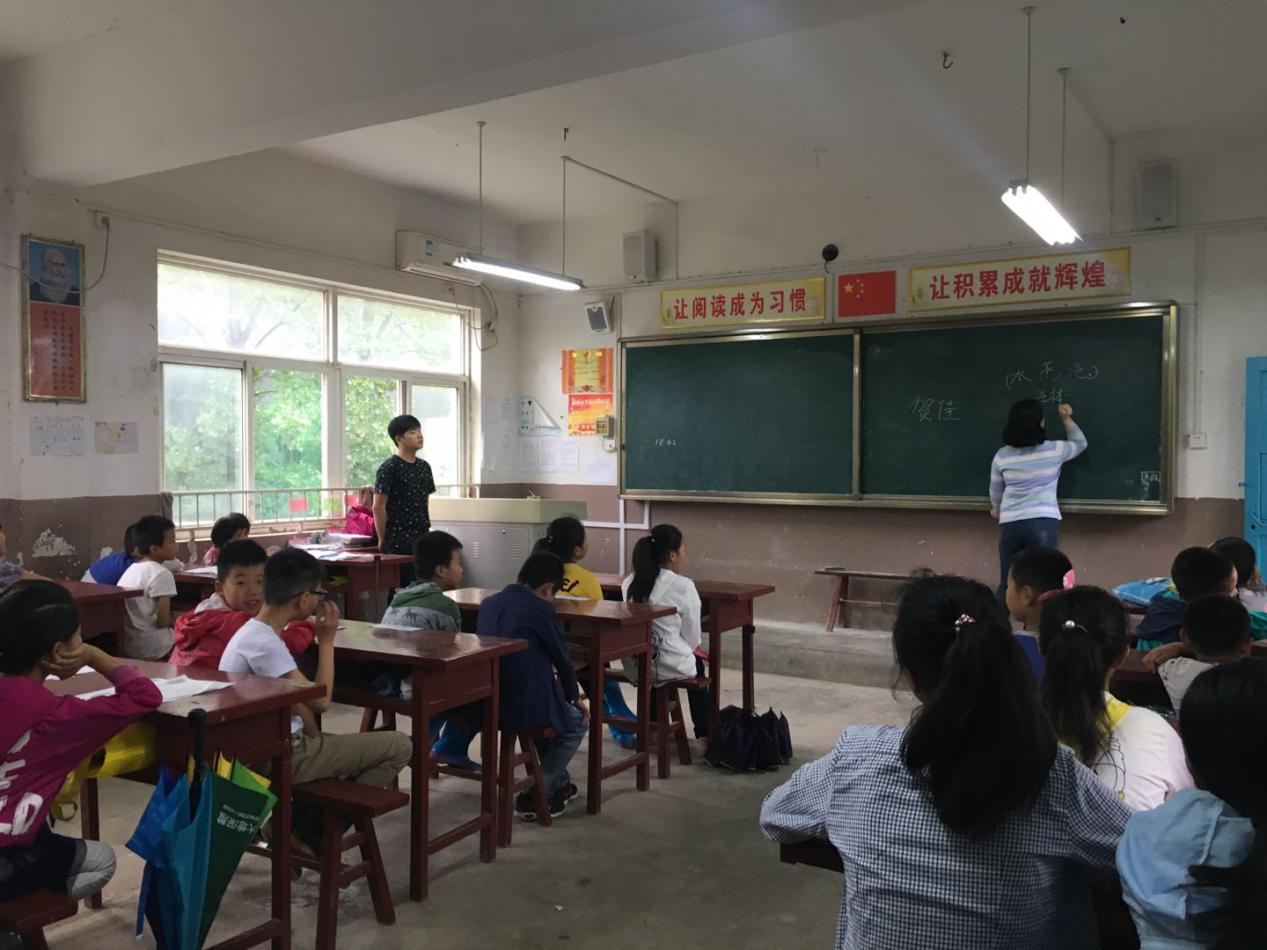 车辆穿过田间小路,来到鸣犊街道师村小学,2015年校舍重建后,学生们有了现在硬件设施完备、学习环境多样的良好条件,也大大提高了学校的教学水平和学生的学习热情。虽然大雨滂沱,但没有抵挡青年教师和研究生们的热情。研究生党员贺佳借今天的大雨,向四至六年级学生,生动有趣地讲授了物理“物态变化”方面的知识。研究生党员郑杰同孩子们亲切互动,开展了紧张有趣的教学游戏活动。虽然刚开始,授课的研究生们都有些紧张,但是孩子们的热情与配合给了“支教老师”莫大的鼓舞,课堂气氛越来越活跃,授课也井然有序地得以进行。两位研究生利用板书授课、小游戏放松的形式与孩子们进行了充分交流,整体课堂摆脱了生硬艰涩的填鸭式教学模式,课堂气氛轻松有趣,达到了良好的互动效果。