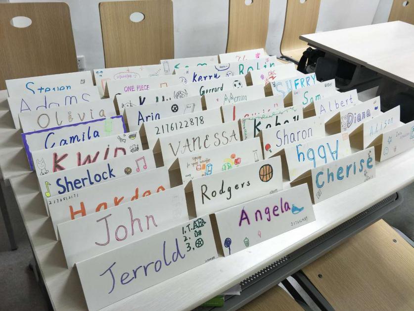 在这个“No Chinese”的课堂上,我们被全英文的环境浸泡着,因此相互交流、彼此称呼都靠英语,于是我们在第一堂课上就制作了自己的英文名牌,每个同学还会在名牌上画上自己爱好的事情或事物,个性化又趣味横生。