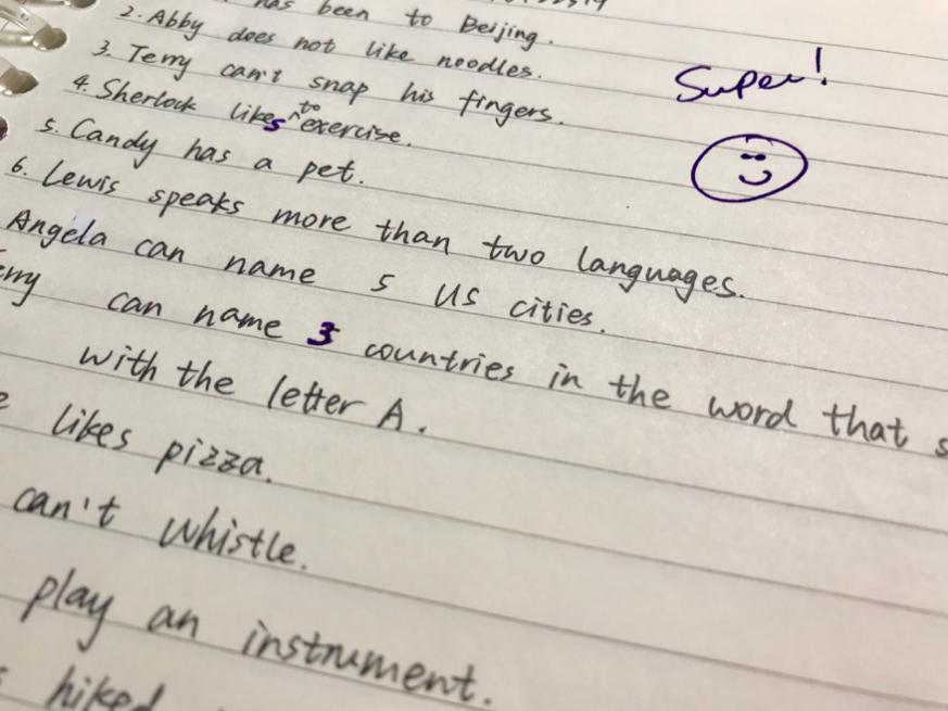除了听力和口语,我们也会练习到阅读和写作。在书面交流上,我们不能仅限于只会书写零碎的英文单词,老师更重视我们能写出完整的句子。她让我们写文章写短句,来锻炼我们的读写能力。完成之后,老师们还会收走我们完成的纸张,在课后批改,并用彩笔留下并不刺眼的纠错痕迹以及可爱的笑脸。
