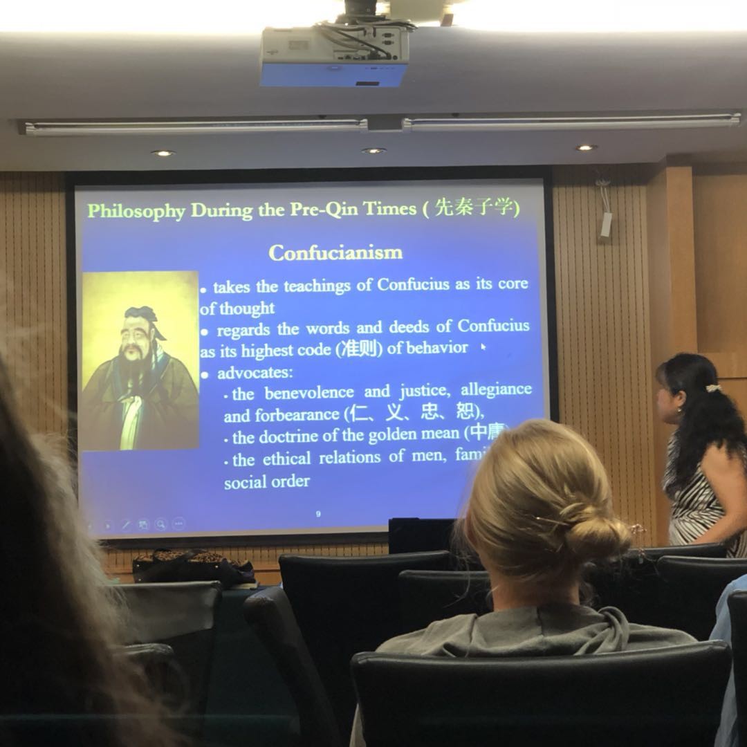 中国哲学思想博大精深,靳老师用短短的两个小时向前来参加交大小学期的67位外教讲解了中国古代哲学思想。讲座开场的方式让人印象深刻,靳老师结合西安十三朝古都的历史,通过学唱歌曲的形式讲述了中国悠久的历史文化。随后靳老师以《论语》和孔子的生平切入,简要介绍了中国古代哲学思想的发展历程:先秦子学、两汉经学、魏晋玄学、隋唐佛学、宋明理学和明清实学。在先秦诸子的学说的基础上,靳老师重点阐述了孔子和儒家学说。孔子是天人之学的开创者之一,通过比较孔子和苏格拉底,嘉宾们对孔子肃然起敬,对中国悠久的历史文化顿生敬仰之心。孔子的天人之学以及孔子的教育理念令在座嘉宾印象深刻。靳老师随后带领他们一起研读《论语》。当读到“己所不欲勿施于人”时,外教频频点头,颇有同感。讲座最后,靳蓉老师与各位嘉宾进行互动,答疑解惑、交流感悟。讲座现场气氛热烈。