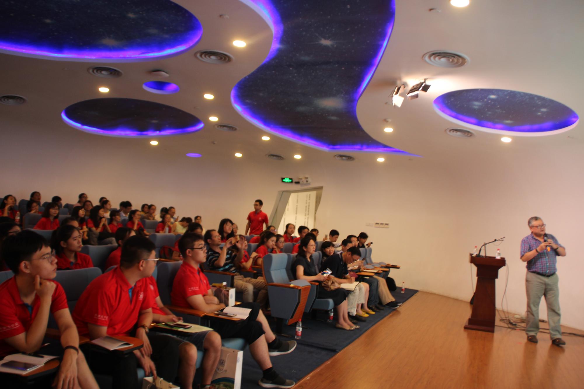18日下午,营员们在钱学森图书馆星空报告厅聆听了两场讲座。首先,曾任中国驻波兰、意大利、印度、阿富汗等国特命全权大使、外交部阿富汗事务特使、外交部发言人孙玉玺做了以“解谜外交部新闻发言人—谈美国轰炸中国驻南斯拉夫大使馆谈判事宜”为题的讲座,带领大家一起走进了外交官的真实生活。接下来,国际世界语学院院士刘海涛教授以“计量语言学概览:历史、理论、方法、资源”为题做了精彩纷呈的报告。
