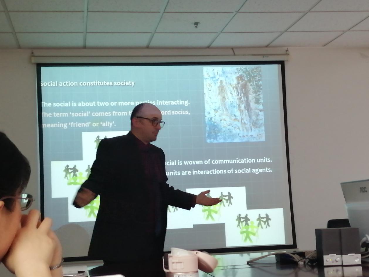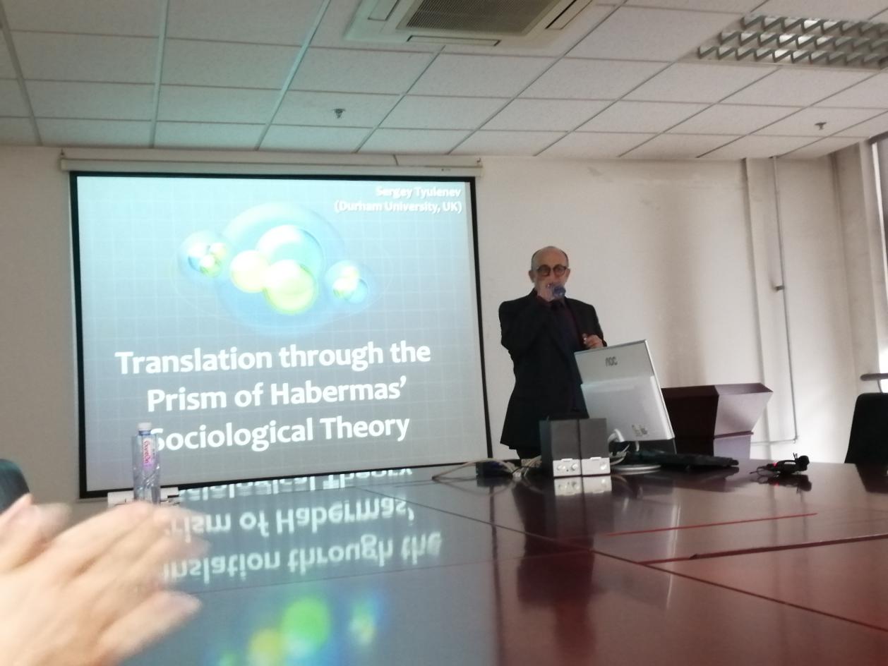 27日下午16:00,Surgey老师开始分享“哈贝马斯理论下的翻译”,用鱼缸里的鱼、和大海里的鱼、泡泡等意象开场,“鱼在鱼缸里,是处于非自然环境,而大海是自然环境,却风险重重”,娓娓道来,引人入胜。Sergey老师介绍到,哈贝马斯是20世纪下半叶最重要的德国哲学家,著有“沟通行为理论”The Theory of Communicative Action (1981)、“社会场域的结构转型理论”The Structural Transformation of the Public Sphere (1962),在学界享有盛誉。