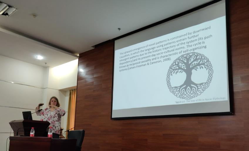 副院长王敏教授主持,陈向京院长致欢迎辞,赞扬此次高端对话在国内少有,同时认为其主题与本学科的联合培养博士点的方向非常契合。Larsen-Freeman教授首先带来以复杂动态系统理论为主题的报告,指出该理论的核心是变化,其系统性源于自动构建的关系网络,并不断适应新的情景。语言恰恰就是这样一个复杂的适应性系统。其中涌现主义需要宏观层面的定量分析和个案的定性分析。基于该理论的教学和研究广泛的用于第二语言习得、语言教师教育、应用语言学、语言教学方法以及复杂系统理论。她认为二语学习过程是一个社会认知过程,强调了社会互动的重要性和社会互动所构成的网络集合对语言学习的重要促进作用。
