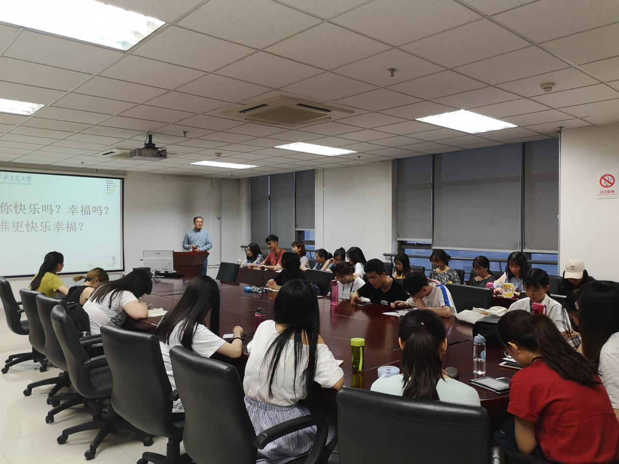 特邀校心理健康中心主任姚斌老师,做题为“调整心态,感受幸福”的讲座。学院党委副书记许明老师,2017级、2018级研究生及部分2019级新生参加此次讲座,讲座由辅导员张曦老师主持。