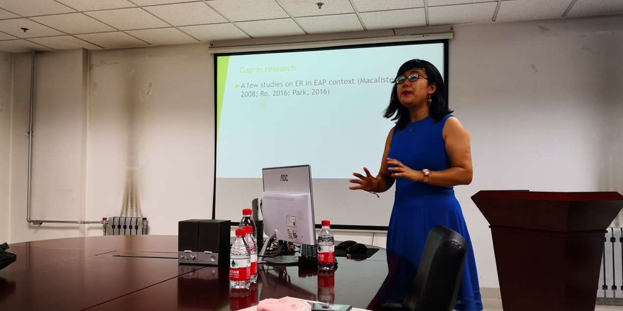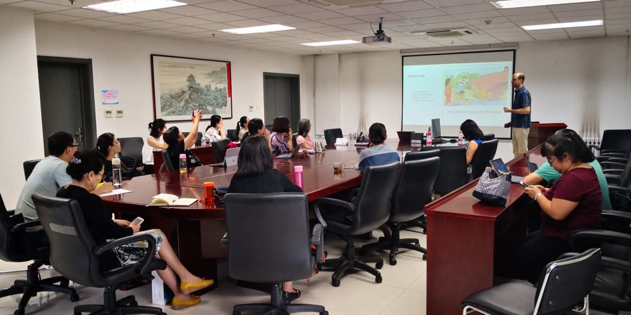 在随后的讲座中,周静助理教授介绍了她与导师Richard Day在美国高校开展的网上泛读在学术英语(EAP) 课程中使用的研究,研究考察了五十七名参加学术英语课程的美国大学生,在使用XReading网络分级读物图书馆进行为期两个学期的泛读学习后的学校效果,及同学们的反应。 研究发现在进行网上泛读仅一个学期之后,学生的阅读态度便显著提升。两学期学习结束后,学习者认为自己的阅读速度,语法,词汇,阅读理解,写作和口语水平均得到提高。该研究进一步证实了开展英语泛读教学的必要性和有效性。