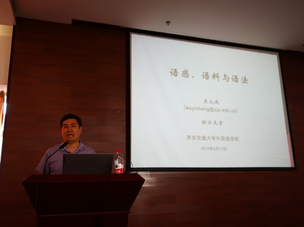 在第二场“语感、语料与语法”的讲座中,吴义诚教授阐明了语感、语料与语法之间的关系,他指出现代自然科学研究多是群体行为,而语言研究多是个体行为。语法研究者作为个体,通常是凭借自己的语感描写和解释语言现象,个体的语感是个人语言知识的体现,不一定反映出一种语言的语法面貌。对大型语料库的检索即“大众的语感”,将是检验语感是否符合语言事实的最好方法。