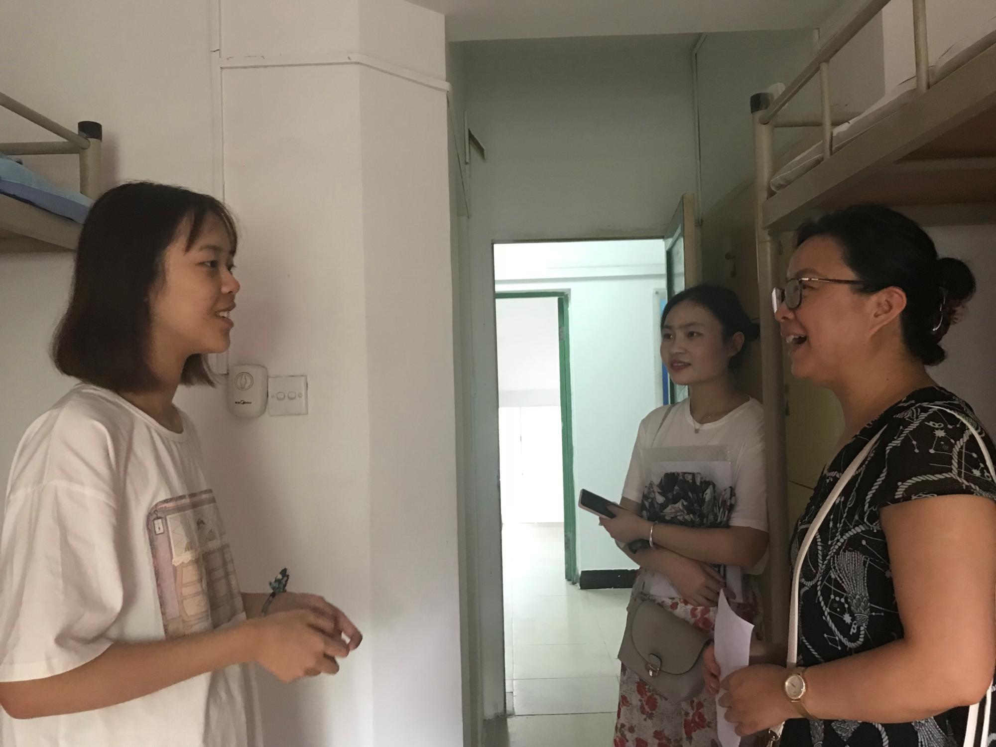 学院院长陈向京、副书记许明、院长助理范晓晖、英语系主任杜丽霞、日语系主任张文丽、法语系主任王奕、班主任孟丽娜、张莉以及研究生辅导员张曦在彭康书院院务主任叶明、辅导员王倩的陪同下来到学生居住的东1、东17、东20宿舍楼,与学生及家长亲切交谈。学院领导、老师详细询问学生基本情况,并就是否适应新的学习生活环境,专业选择意向等学生及家长的提问给予耐心的解答。他们还叮嘱同学们遇到困难要及时和辅导员、班主任沟通交流。热情的话语、亲切的问候,是学院对新生们的关怀,使他们来到学校仍有家的感觉。