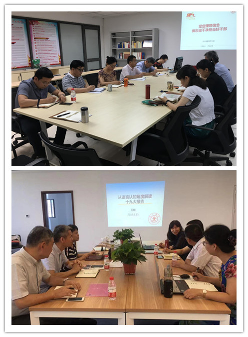 党政领导班子分别在兴庆校区外文楼和创新港文科楼5楼会议室开展“不忘初心、牢记使命”专题学习读书会。学院党委书记杨小渭以“坚定理想信念,做忠诚干净担当的好干部”为题,讲授自己学习《理想信念是中国共产党人的政治灵魂》等文章的心得体会,副院长王敏以“从语言认知角度解读十九大报告”为题,分享学习心得。