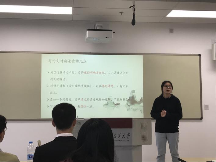 2018级的肖寒学姐为我们分享了她在澳门大学求学期间的学术会议经历,对同学们的论文写作提出了宝贵意见:1. 用理论解读文本时,要将理论明确并强化,而不是做泛化主题式的解读。2. 对研究对象(或文章的关键词)一定要界定清楚,不能产生歧义。3. 看待一个问题时,要从多元的角度观察和理解,不能刻板化。4. 写文章要注重理性而非感性。
