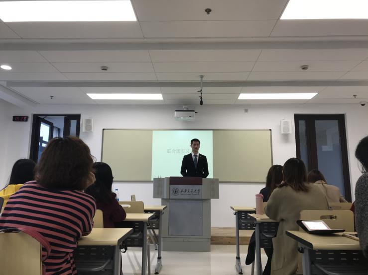 安旭飞学长为我们分享了他在联合国的实习见闻,并从口译实践的角度带领同学们解读王毅外长的讲话。