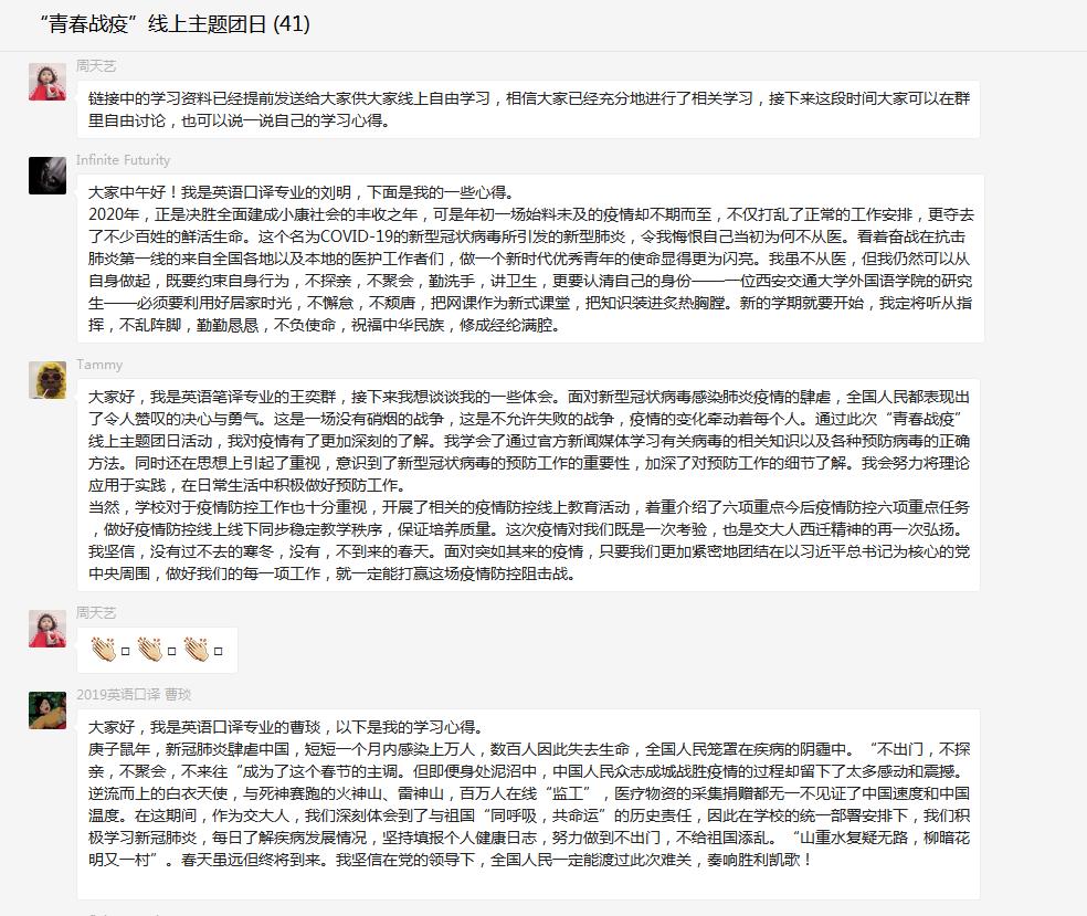 全体硕士生也通过此次“青春战疫”线上主题会议提高了自己的思想觉悟,增强了政治自信,并明确了作为一名团员,作为交大的一份子今后的努力方向。