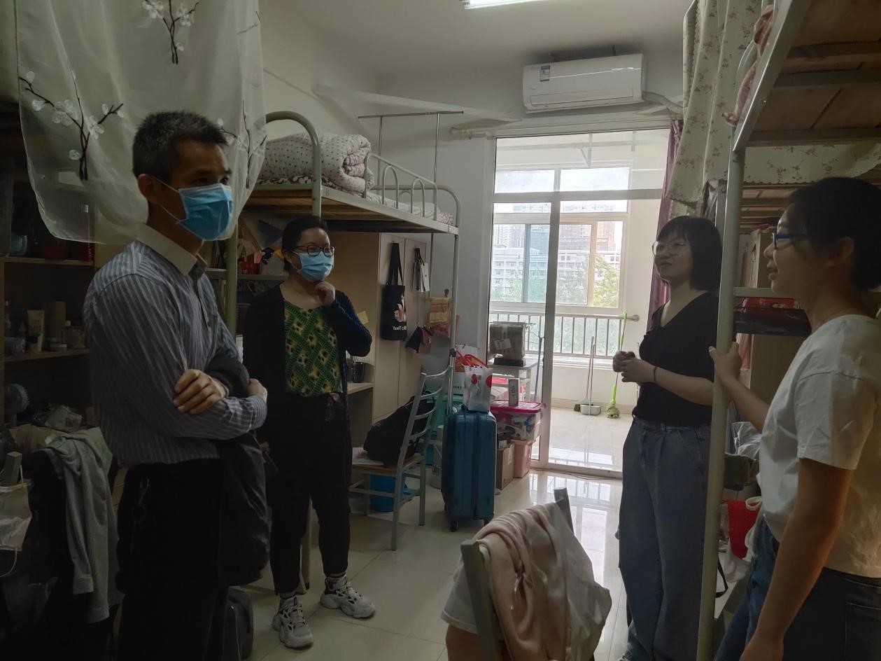 走进每一间宿舍,杨小渭书记与许明副书记都与学生亲切交谈,关切地询问了学生们在返校途中的情况,是否适应返校后的疫情防控举措,学习生活方面还有什么困难等。老师们还就同学们关心的毕业、就业等方面给出了建议与指导,并叮嘱同学们遵循疫情期间学校的防控管理措施,尽量少出校门,做好每日清洁卫生,遇到困难时主动与辅导员以及学院联系,帮助大家共同解决问题。