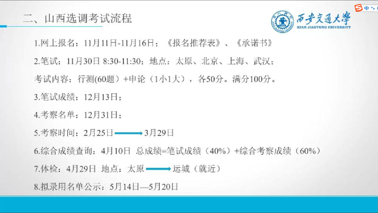 在考取选调生的经验分享方面,和智鹏和范蕊两位同学分别介绍了考取山西及陕西选调生的情况。和智鹏详细地讲解了考取选调生的报考流程,范蕊则分享了一些复习、备考上的宝贵建议。两位同学的分享让同学们对如何考取选调生有了更多的了解与认识。