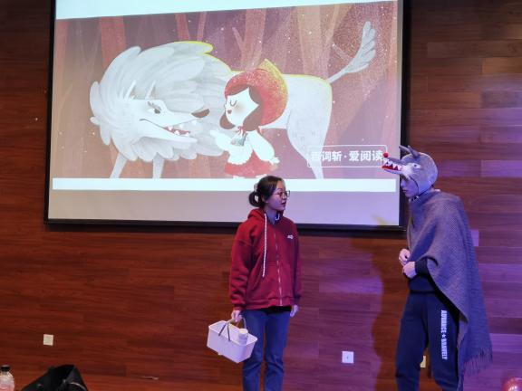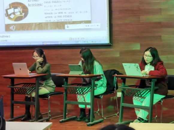 第一场话剧是英法81班带来的《小美人鱼》(La petit Sirène),演员们精心准备PPT背景、服装道具,精致的妆容,他们大方的演技赢得台下评委和观众阵阵欢声笑语。第二场话剧是一出自编的小品——《网课》(Cour en Ligne),演出者们分别扮演学生、老师和家长,表演了疫情期间线上上课的众态,自我调侃,很有代入感。最后一个话剧表演《小红帽》,(Le Petit Chaperon Rouge)表演者选择忠于原著,唤醒了大家童年沉睡的记忆。