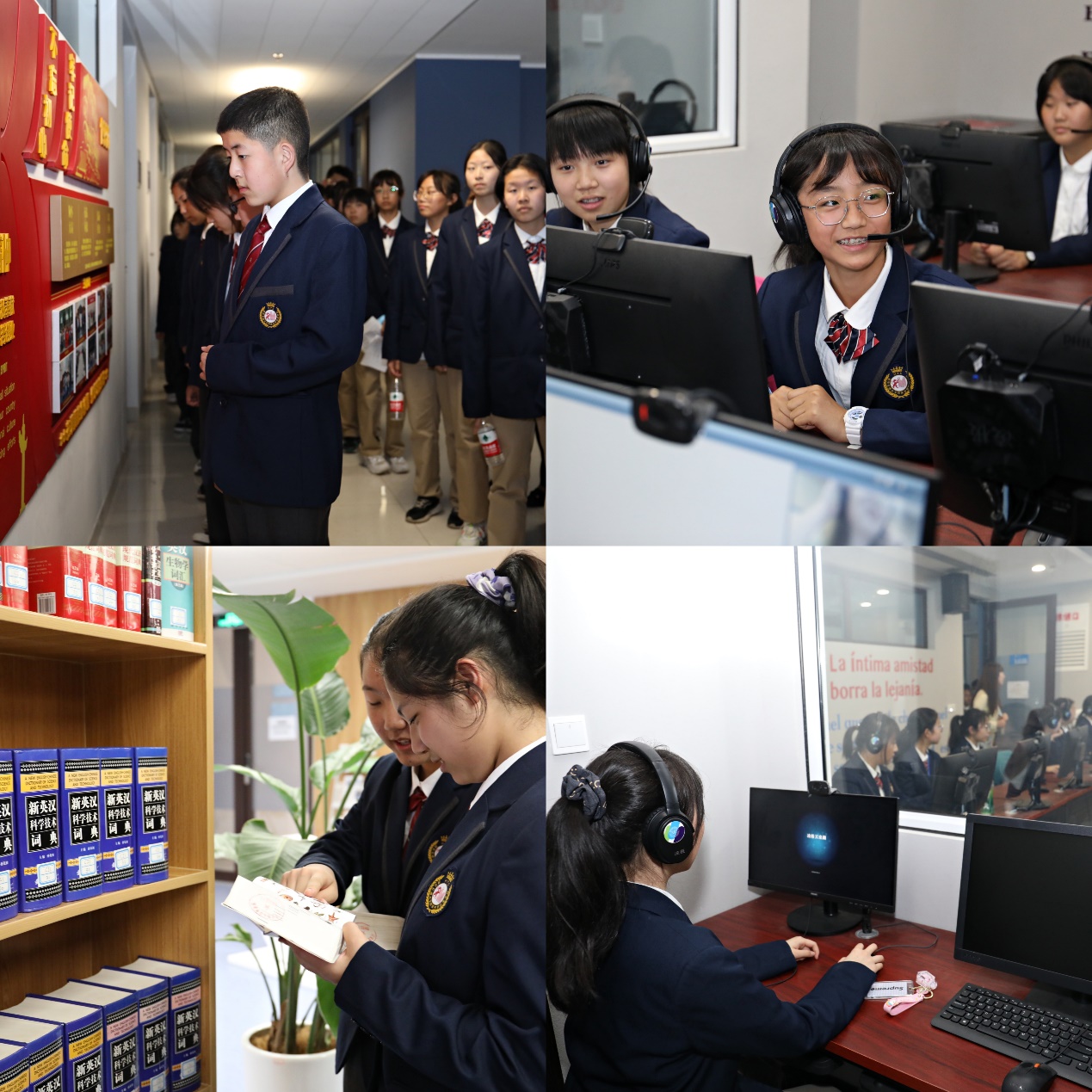 交流会后,硕士研究生马瑞、张若彤带领航天学校的师生参观了语言文化及国际交流研究中心的不言书屋、同传室、一带一路研究中心、非洲研究院和校企合作基地医学外语研究中心等,进一步激发了航天学校的同学们对外语学习的兴趣。