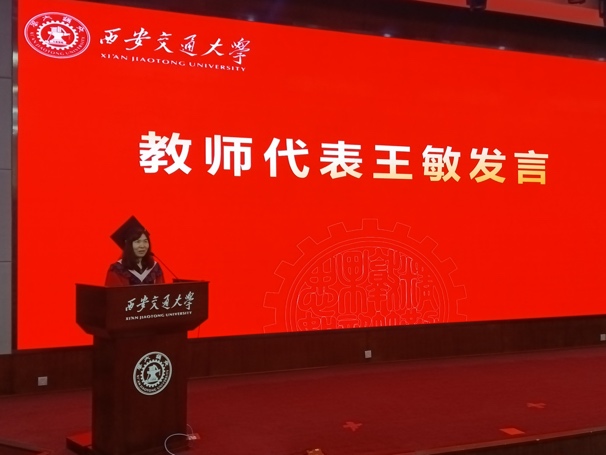 “时间像一只藏在黑暗中温柔的手,在你一出神一恍惚之间,物走星移。”在感叹校园时光飞逝的同时,王敏老师勉励同学们扬帆起航再出发。英文单词“commencement”既有毕业典礼的意思,也有开端的意思,王敏老师对于这一单词的思考让同学们感悟到毕业典礼是人生旅程新的起点,要以独立的人格、坚毅的品格背上行囊再出发。