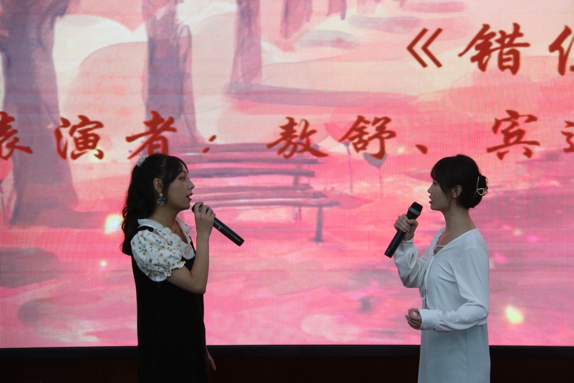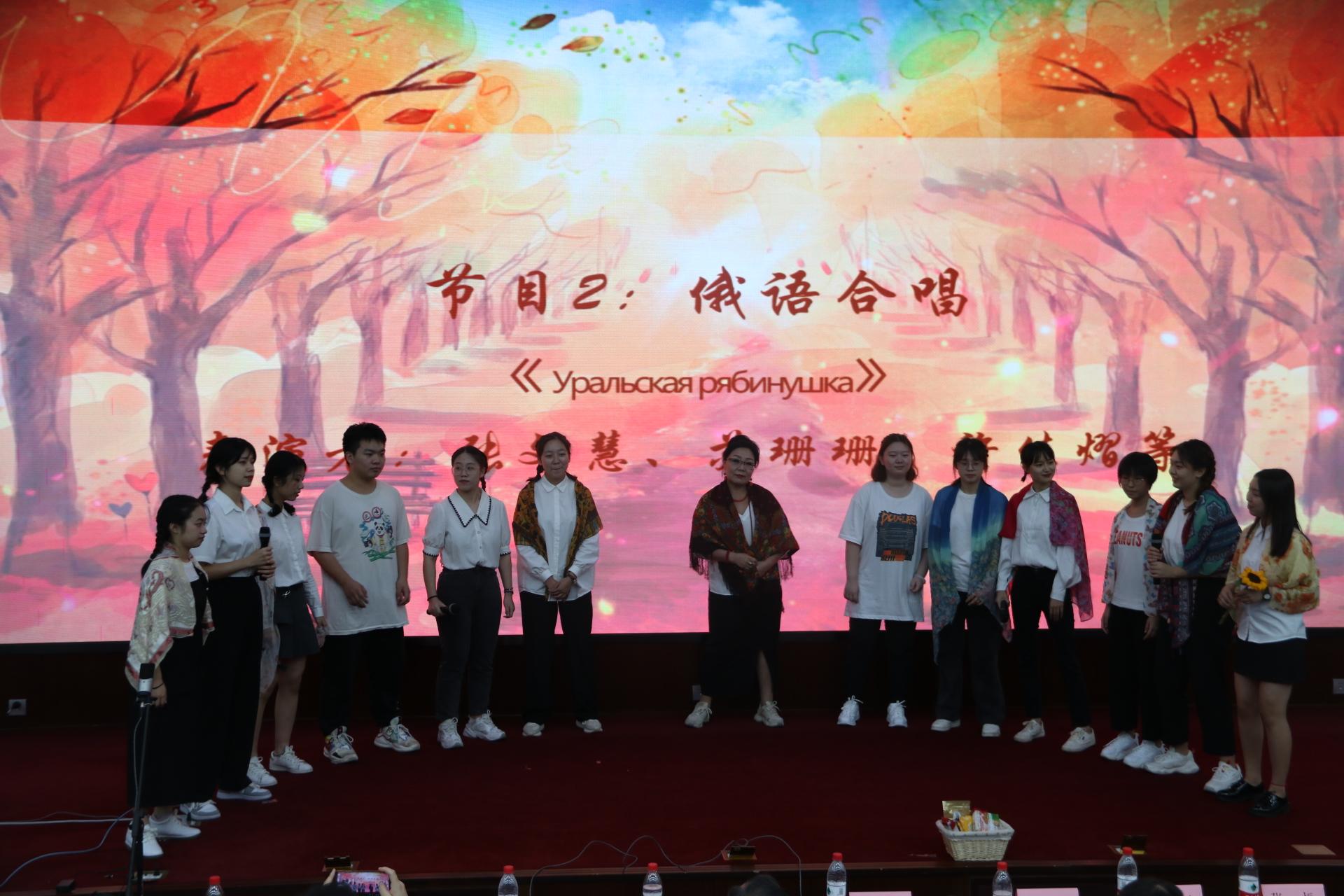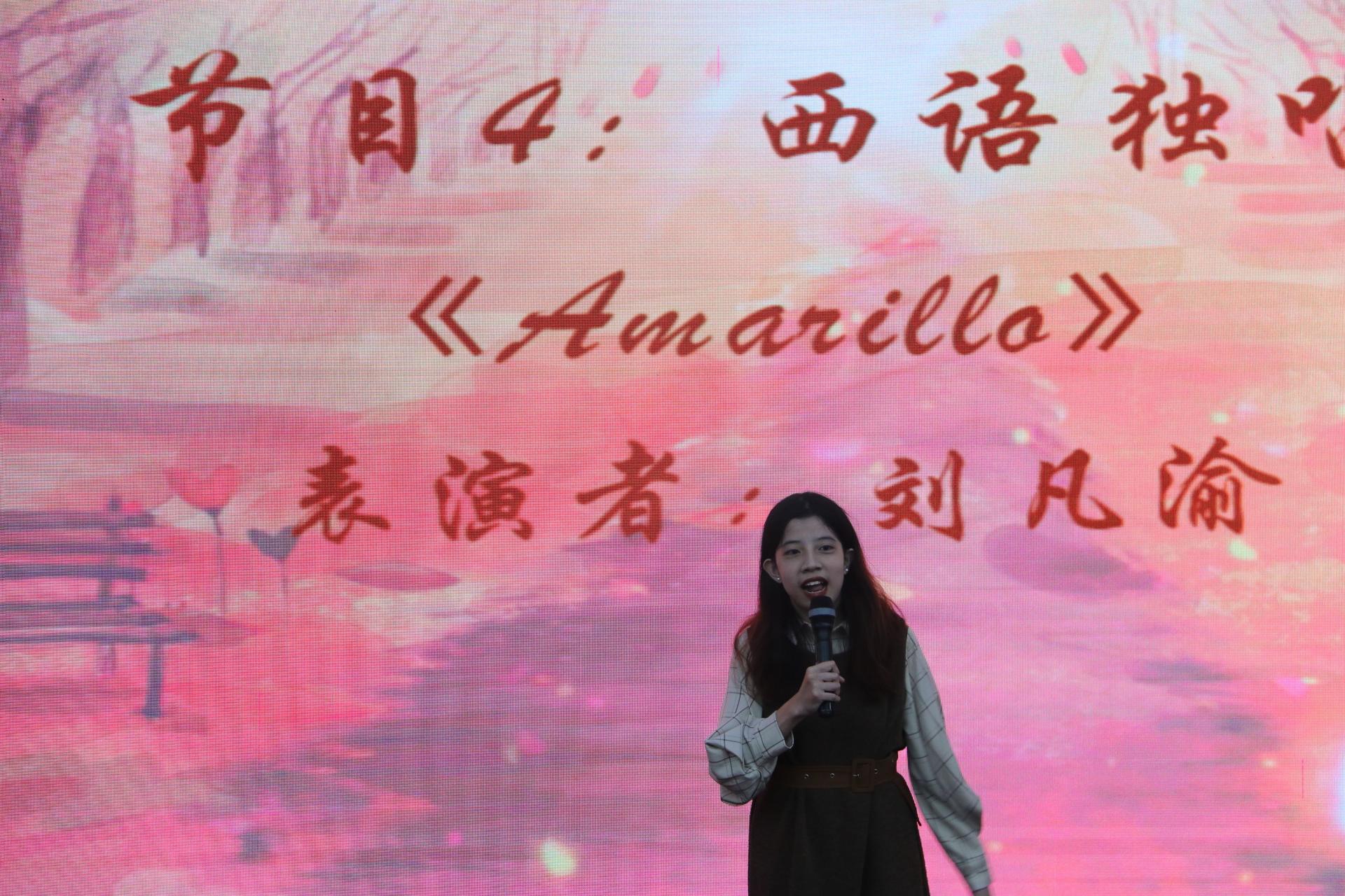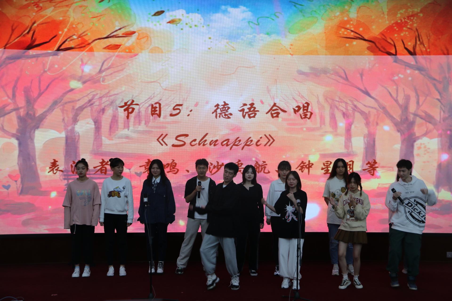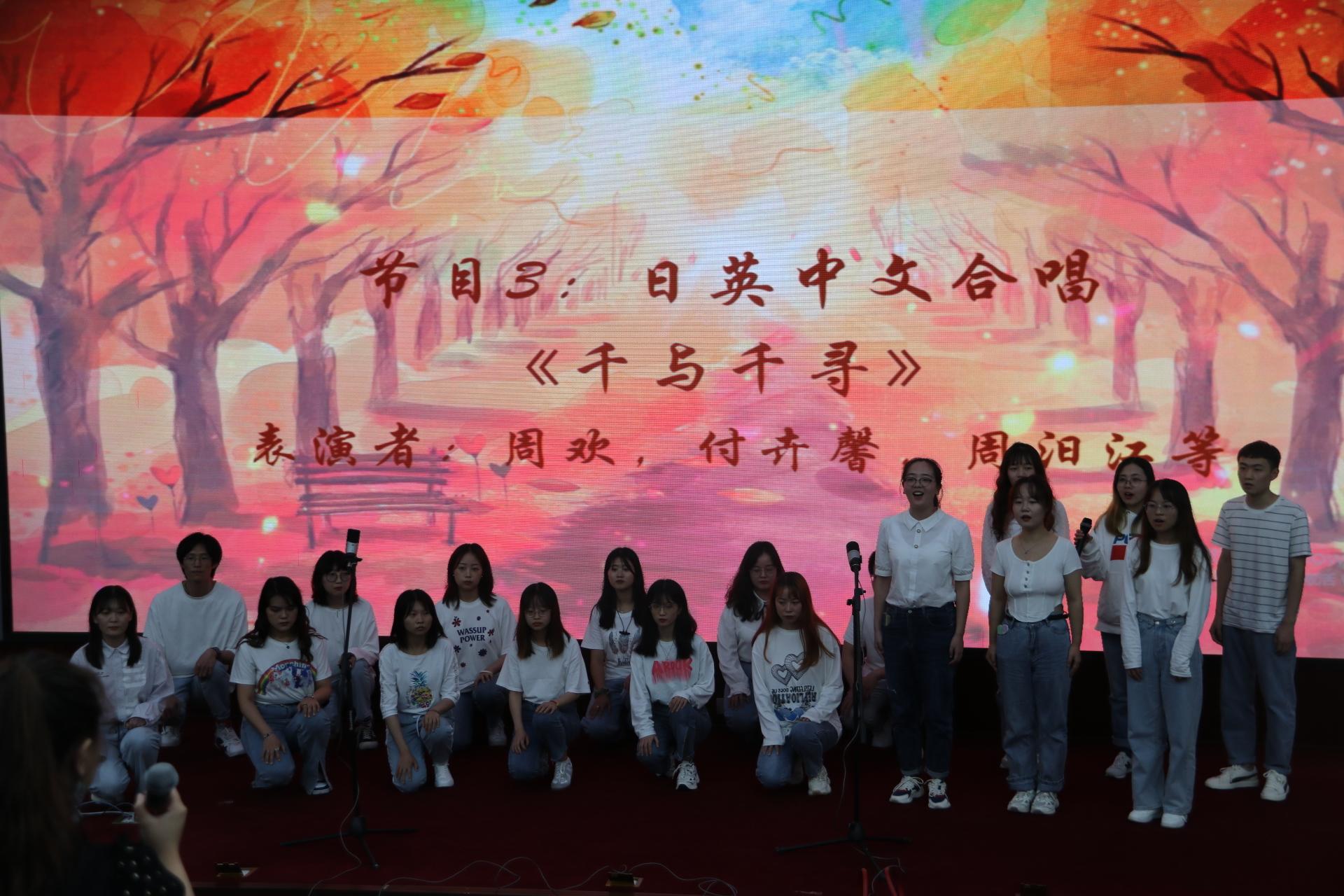接下来是表演环节。由敖舒、宾逸雪、郎月恒、李宛芯同学用中日英法四语合唱《错位时空》,歌声优美动听。随后,俄语系的老师和同学表演了俄语合唱《山楂树》,S1107班同学带来了中日英文合唱《千与千寻》;最后,由刘凡渝同学独唱西语歌曲Amarillo以及袁鸣等同学合唱德语歌曲Schnappi。交大学子多才多艺、青春澎湃的精神风貌在舞台之上得到淋漓尽致的展现,其精彩的表演赢得了领导、老师和观众们的阵阵掌声。