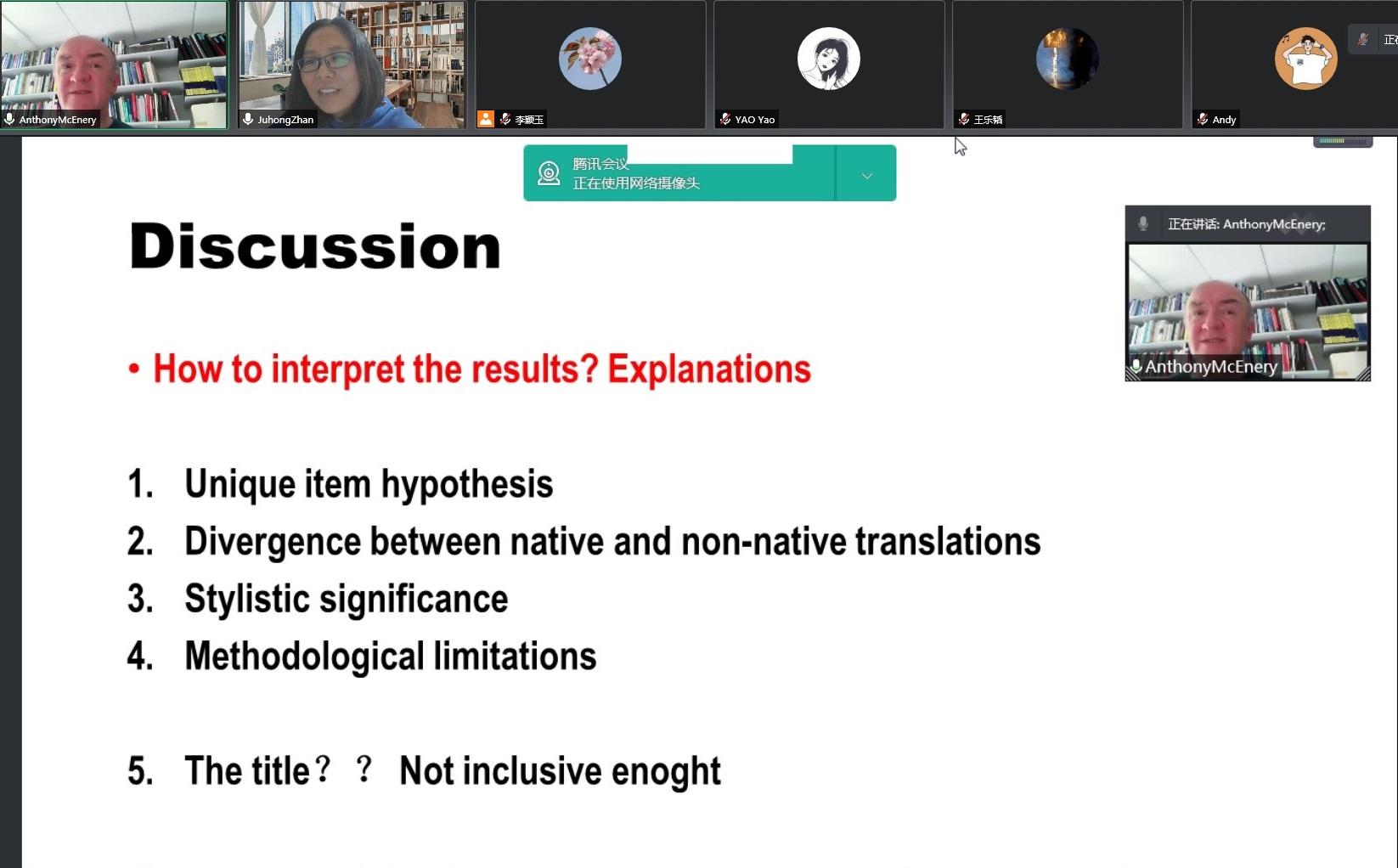 在学术交流活动部分,詹菊红副教授和博士生姚瑶、赵红霞分别就自己正在进行的研究进行了汇报,话题涉及UIH与翻译方向、城市形象构建、CDA与经济类语篇等。McEnery院士认真听取了汇报,并就研究中的具体问题和难点进行了回答和指导,同时特别提醒大家,将语料库应用于这些研究时有一些细节问题需要格外注意,不然会导致数据和结论错误。