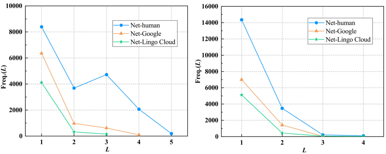 图3 机器译本网络与人工译本网络的最短路径长度之比较